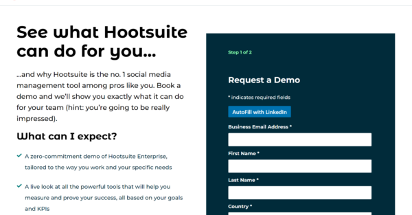 Their demo page outlines what you can expect from the demo and includes social proof badges and a few client testimonials. The signup form only has five fields to fill in and you can opt to prefill it with LinkedIn to speed up the process.