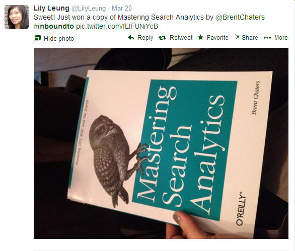 Three copies of Brent Chaters’ Marketing Search Analytics, as well as one copy of Alistair Croll and Benjamin Yoskovitz’s Lean Analytics, were given away to four attendees who asked questions that evening: