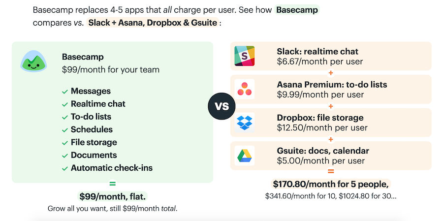 Finally, if possible, you should show how your pricing compares to competitors. Basecamp does this better than any other SaaS product I’ve seen: